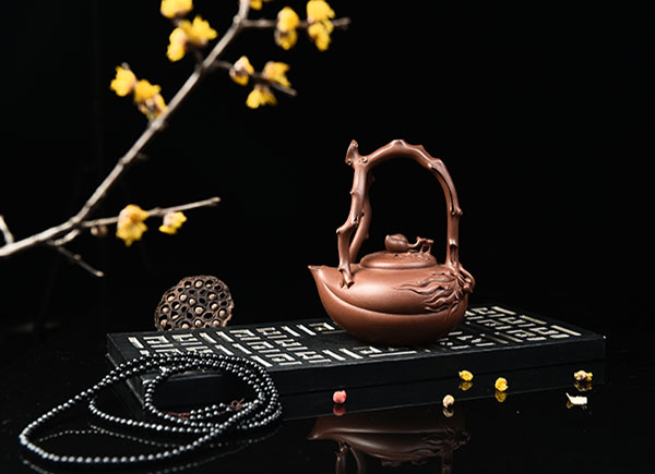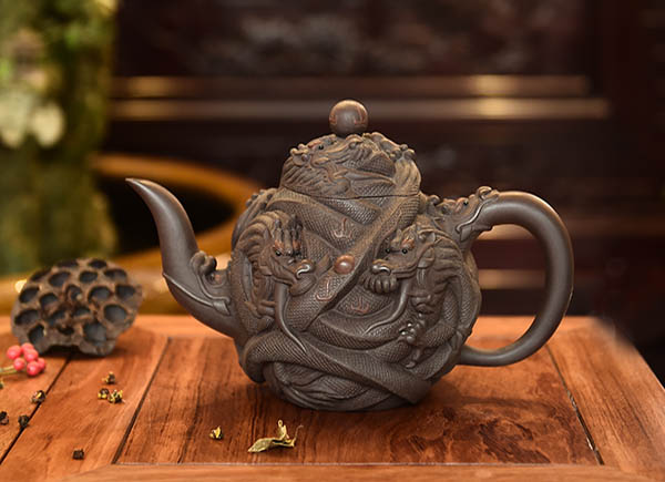 葛岳純父子皆擅長花貨的制作,其中家族代表作九龍至尊壺是由葛超美設(shè)計,其父親葛岳純制作完成,遠看壺型整體氣韻流暢,近看做工精美無暇,是父子合作的經(jīng)典之作,現(xiàn)已注冊外觀專利和終身版權(quán)。后葛超美在其父親傳統(tǒng)技法的基礎(chǔ)上,吸收其藝術(shù)菁華,創(chuàng)造革新,制作出更為精致、富有立體感的九龍至尊壺,九龍盤壺戲珠,浮雕云騰致雨,精致于細發(fā),大氣于天地,寓意天降祥瑞,國泰民安。